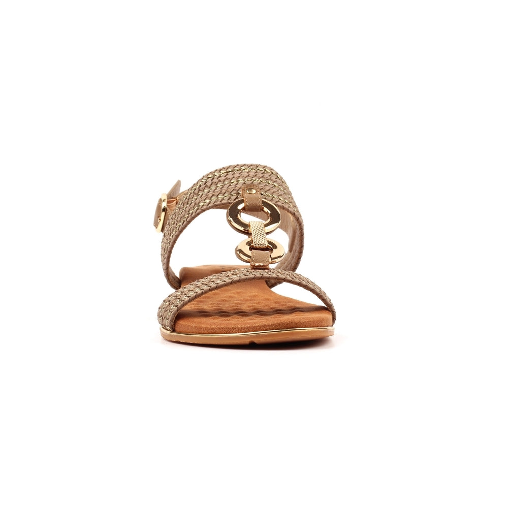 Step into summer sophistication with the Mila khaki sandal. Featuring chic woven-effect straps and a gold-tone chain detail, this sandal combines subtle glamour with everyday comfort. The padded insole keeps you supported, while the adjustable ankle strap ensures the perfect fit. From city breaks to summer evenings, Mila is a versatile piece that elevates your warm-weather wardrobe.